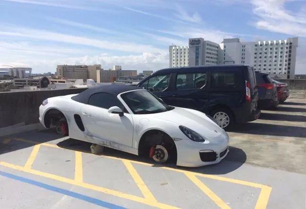 下面就是这辆停在路边被偷走四个轮毂的保时捷Cayman,从照片中我们能够看到,嫌疑人是用千斤顶将车顶起来,偷走轮毂之后,用砖块将车子支撑在原地。