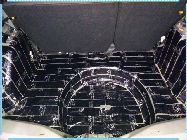 汽车底盘和尾箱主要是低频共振噪声,因此都匀元音改使用大白鲨隔音材料对汽车的底盘做了双层的隔音处理。大白鲨隔音减震胶由5层材料组成,第一层的凹凸铝面遏制了反射噪声,第二、第三和第四层的丁基橡胶遏制了低频共振的噪声。第五层的材料则有效的保障了各种材料的性能。
