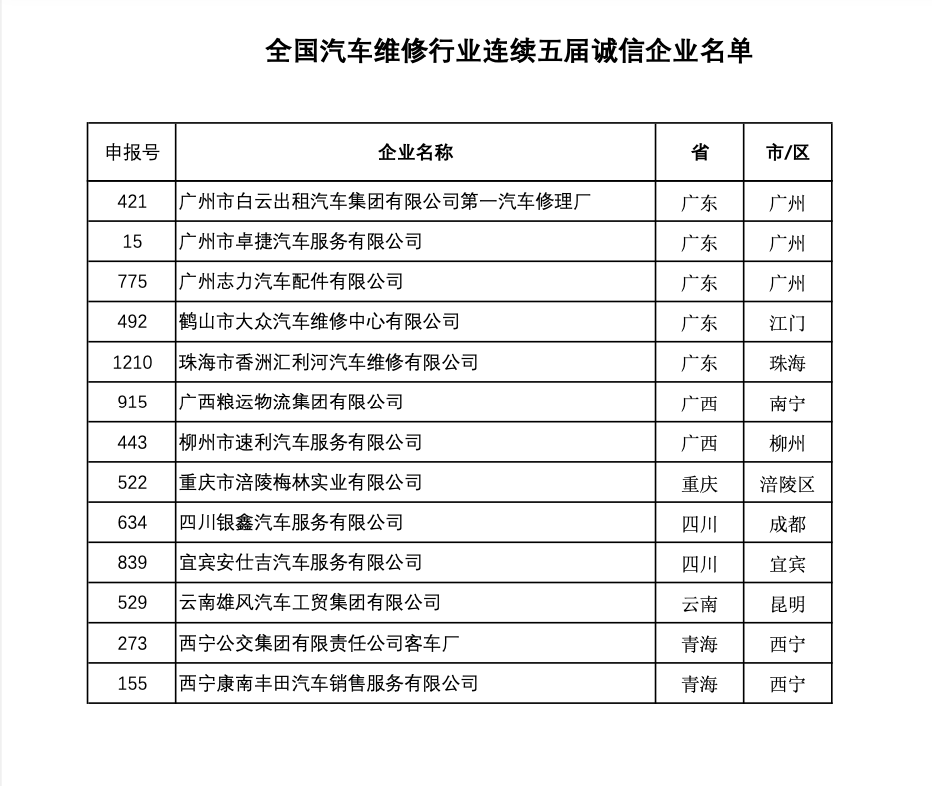 2017-2018年度全国汽车维修行业诚信企业名单(广东省)