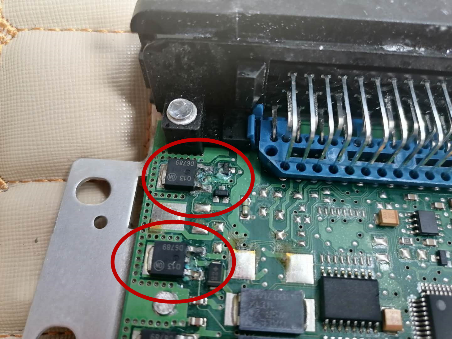 在副驾驶地板下拆出变速箱电脑,电脑盒表面有大量水渍。