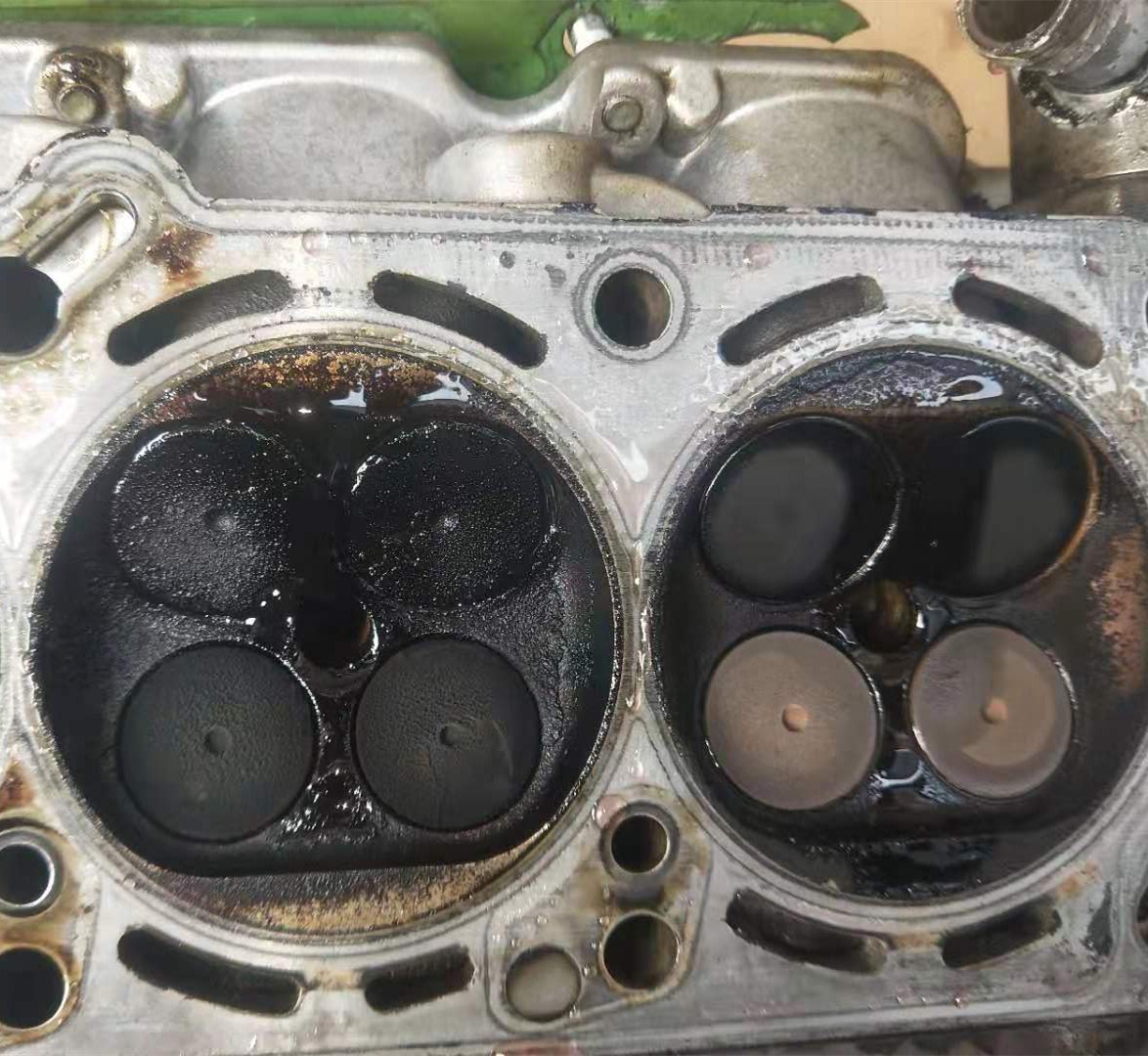 2-3缸进气门积碳严重,1-4缸还不错。排气门2-3气门潮湿,说明燃烧不好。