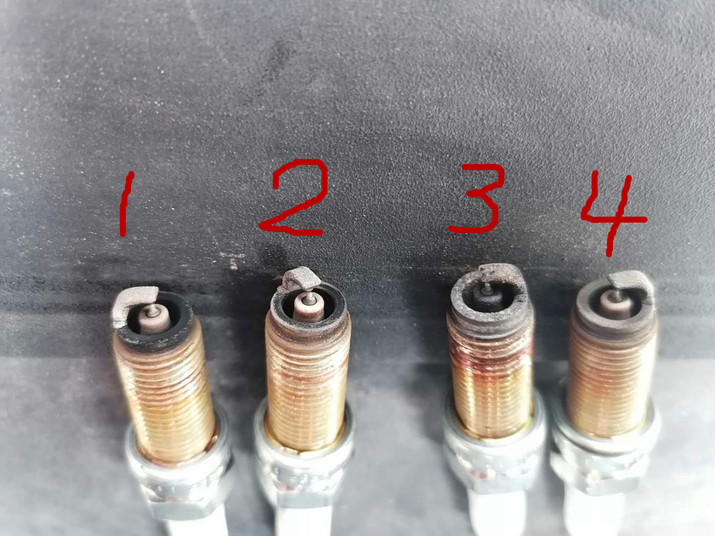 大家注意看,3缸气门比较潮湿与1-2-4缸颜色不一样。