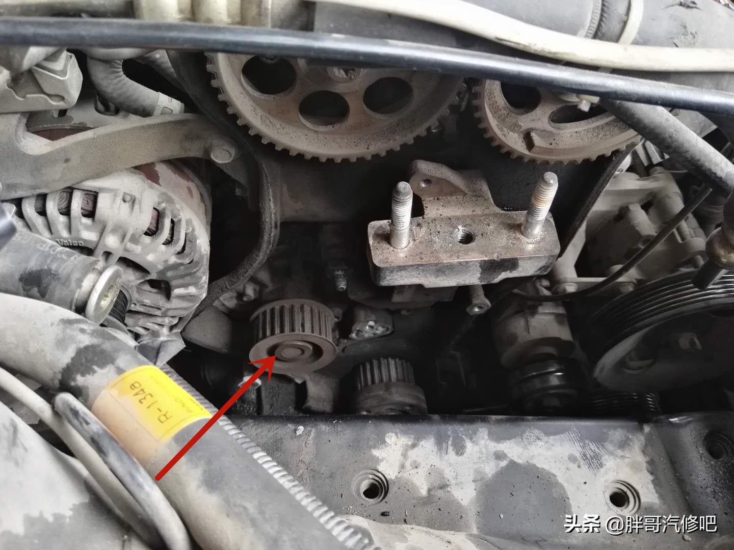 拆下正时皮带,景程的发动机比较老,箭头标记为内置水泵。