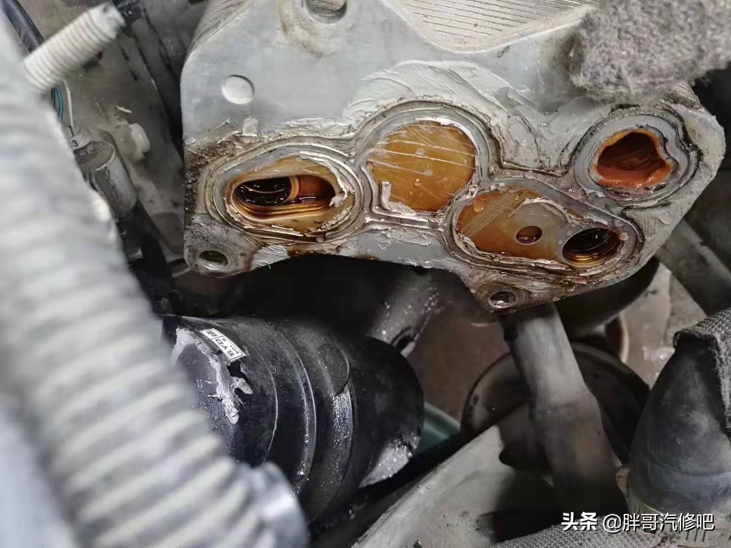 从发动机地面漏油位置,胖哥判断是机油散热器漏油。