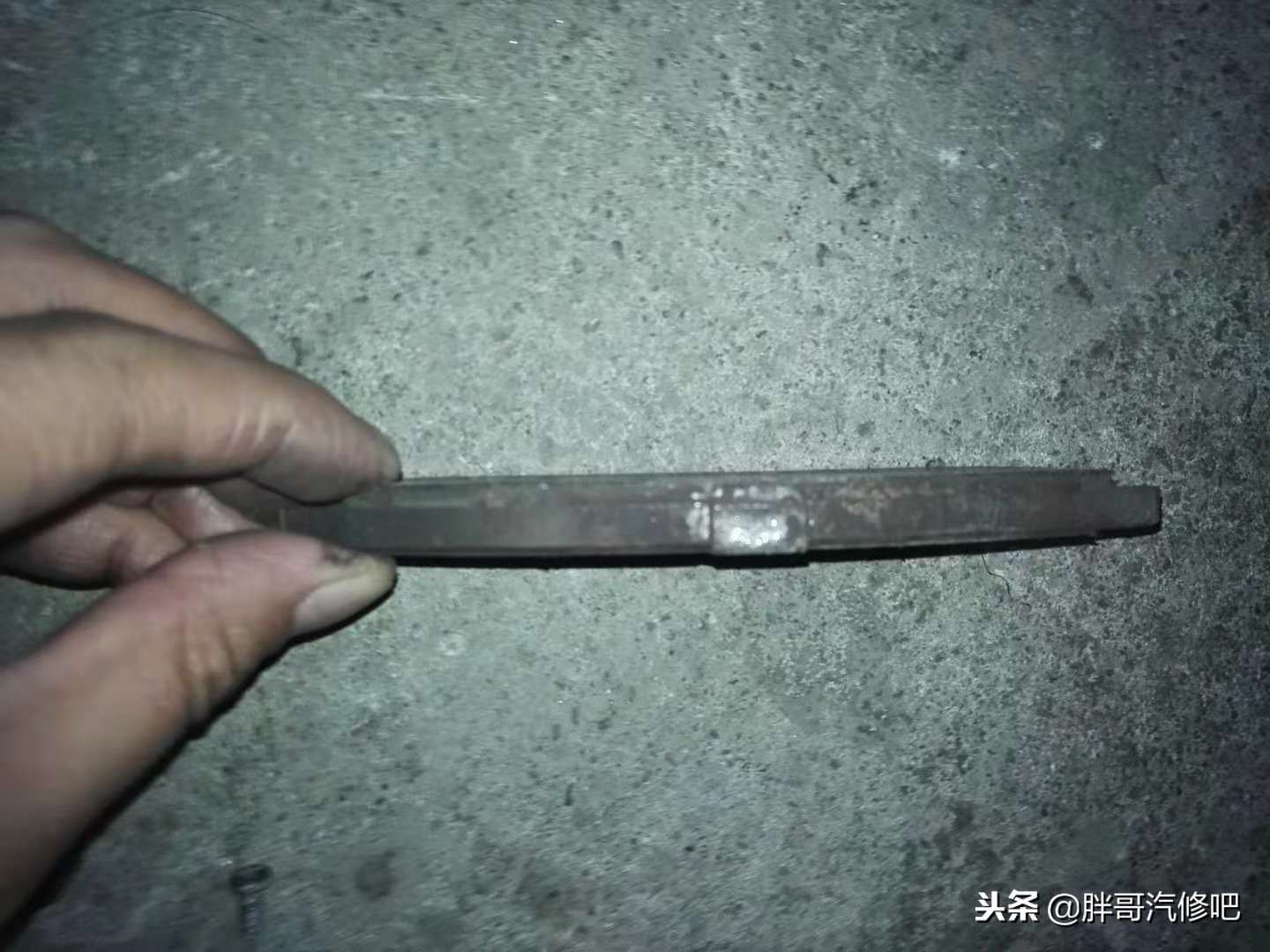 下面是见证奇迹的时刻,内侧刹车片怎么不见了?就算刹车片磨损殆尽,那后面还有一层5毫米厚的钢板怎么也不见了。胖哥负责任的告诉大家拆开时就没有发现,只剩下钢板后面一层刹车片报警器薄铁皮。