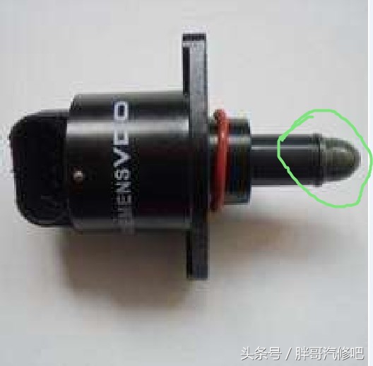下图所标记圆圈为怠速马达伸缩头。往外伸进气量减少,发动机转速降低。往里缩进气量增大,转速升高。怠速马达调节为无极调节。