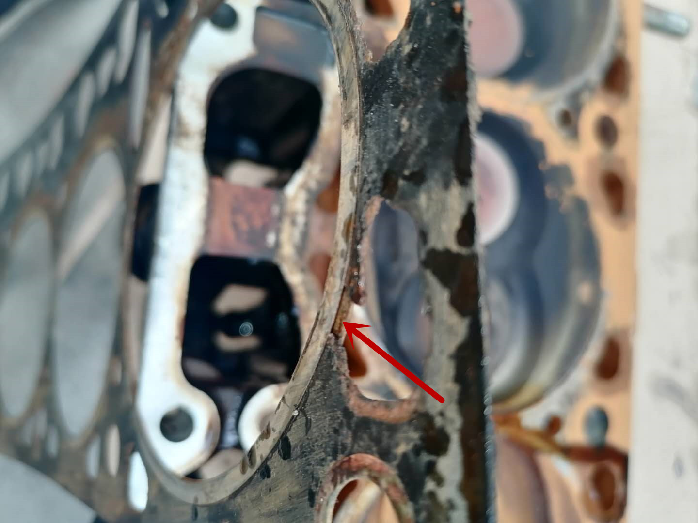 缸垫封口处开裂,冷却液就是从这个地方泄漏进去。