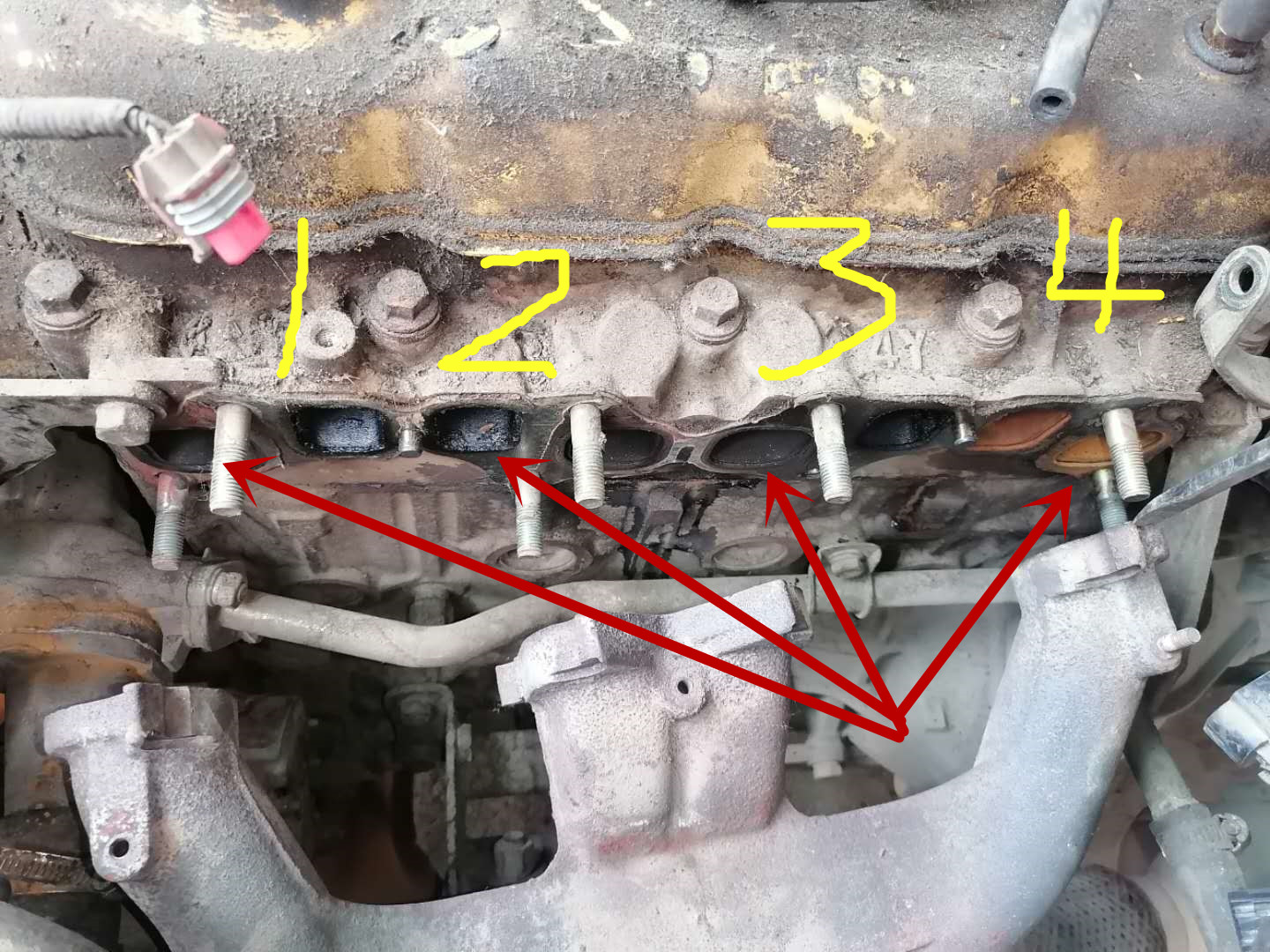 拆下发动机进排气支管,4缸进排气明显与1-2-3缸不一样。