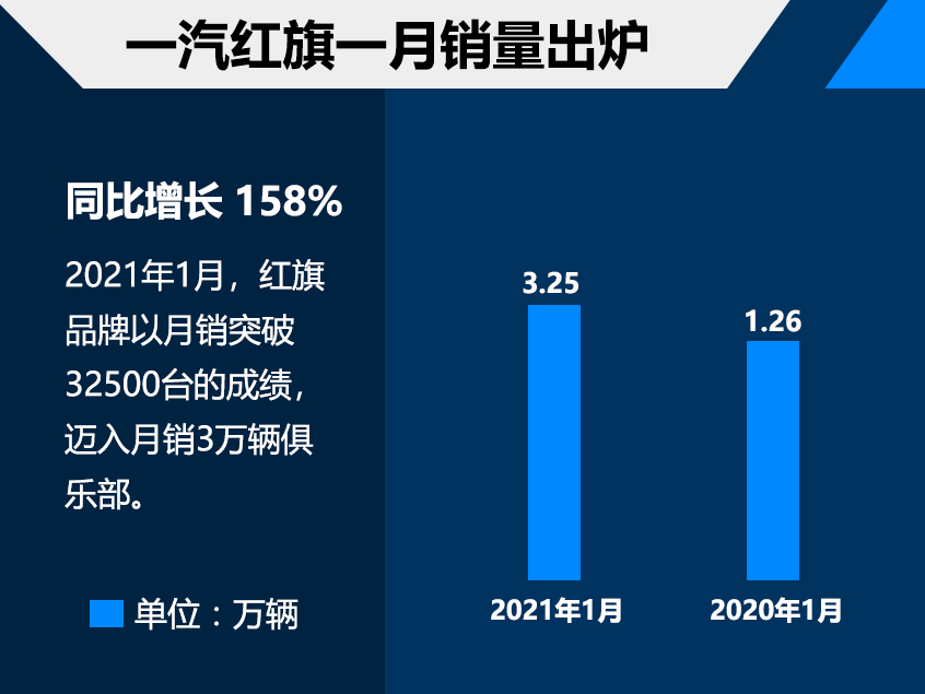 日前,5A汽车获悉,2021年1月,红旗品牌以月销突破32500台的成绩,迈入月销3万辆俱乐部,实现单月销量再次突破;同比增长高达158%,再次实现历史性跨越。今年红旗品牌将向40万销量目标发起冲击,要实现这一艰巨的任务,除了新车型的助力,更离不开服务、营销等多方面的加持。