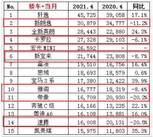 日前,乘联会发布了2021年4月份轿车销量前15名榜单。数据显示,2021年4月份销量前15名轿车中,大多数车型都实现了同比正向增长。但是,也有数款车型销量呈现逆势下滑趋势。